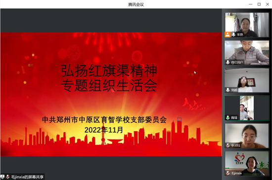 中新河南網(wǎng)11月29日電(吳勇強)為深入學(xué)習(xí)宣傳貫徹二十大精神和黨和國家領(lǐng)導(dǎo)人視察安陽重要講話精神,深刻領(lǐng)會紅旗渠精神的豐富內(nèi)涵和時代價值,弘揚紅旗渠精神,賡續(xù)紅色血脈,不斷增強鄭州市中原區(qū)育智學(xué)校黨支部的組織力、凝聚力、戰(zhàn)斗力,更好發(fā)揮共產(chǎn)黨員先鋒模范作用,11月28日,鄭州市中原區(qū)育智學(xué)校黨支部組織全體黨員線上召開“弘揚紅旗渠精神”專題組織生活會。