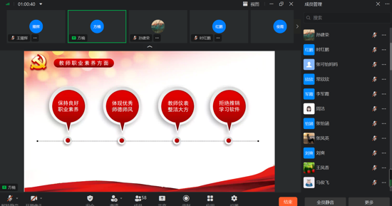 會(huì)上,黨支部副書記方楠從“擁護(hù)黨的方針”“加強(qiáng)思想引領(lǐng)”“帶頭顧全大局”“提升職業(yè)素養(yǎng)”“注意為人師表”“拒接推銷產(chǎn)品”“展現(xiàn)優(yōu)良師風(fēng)”等七個(gè)方面對(duì)全體教師進(jìn)行培訓(xùn)。方楠要求全體教師,在特殊時(shí)期要高度重視師德師風(fēng)建設(shè),保持良好的教師素養(yǎng),時(shí)刻保持清醒的頭腦和教師的尊嚴(yán),提高站位,不碰紅線,聽從組織安排,配合疫情防控,保障自身安全的同時(shí),尋求有效的線上教學(xué)模式,對(duì)學(xué)生狀態(tài)進(jìn)行監(jiān)督,保障教學(xué)質(zhì)量。進(jìn)一步加強(qiáng)家校溝通,做好學(xué)生的心理疏導(dǎo),做好學(xué)生的引路人。