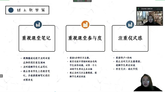 老師們積極交流,匯報了線上教學進度,研討了提高線上教學效率的方式方法和如何高效布置作業(yè)、有效檢測等問題。大家各獻良策,將自己的教育教學經(jīng)驗與同事們分享。