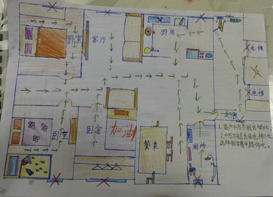 首先,學(xué)生們根據(jù)自己家樓層特點(diǎn)找到正確的逃生出口,然后,清晰地標(biāo)注出每一條逃生路線,最后,詳細(xì)地繪出火災(zāi)初起時(shí)的應(yīng)對(duì)措施,如及時(shí)撥打119,避開電梯從樓梯逃生等,可謂精彩紛呈。