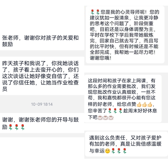 一枝一葉總關(guān)情,一點(diǎn)一滴見(jiàn)初心。張老師把班級(jí)當(dāng)成了家,把學(xué)生當(dāng)成了自己的孩子。一句“老師想你了!”拉近了她與學(xué)生的距離;一聲“在家還好嗎?”給予了學(xué)生滿滿的溫暖。當(dāng)?shù)弥嗉?jí)有一個(gè)孩子的媽媽因工作外出,而不得不獨(dú)自上網(wǎng)課時(shí),張老師很是擔(dān)心。于是她想盡辦法聯(lián)系孩子,每天通過(guò)視頻電話溝通思想,指導(dǎo)學(xué)習(xí)。在張老師無(wú)微不至的關(guān)心下,這個(gè)孩子沒(méi)有落下一節(jié)課,沒(méi)有漏交一次作業(yè)。