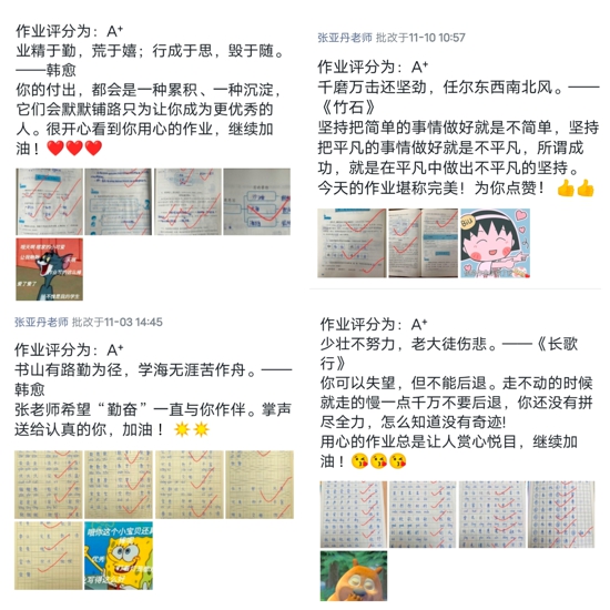 張老師認(rèn)為作業(yè)是與學(xué)生溝通的良好機(jī)會(huì),因此,她每天及時(shí)認(rèn)真批閱每一份作業(yè)。對(duì)于有問(wèn)題的作業(yè)一對(duì)一反饋,對(duì)優(yōu)秀作業(yè)不吝嗇鼓勵(lì),對(duì)進(jìn)步明顯的學(xué)生給予充分肯定。為了充分發(fā)揮作業(yè)的評(píng)價(jià)育人功能,她創(chuàng)新作業(yè)評(píng)語(yǔ),或使用學(xué)生感興趣的表情包,“你是最棒的仔”“你的作業(yè)自帶光環(huán)”;或是送給學(xué)生一句充滿哲理的詩(shī)句,“書山有路勤為徑,學(xué)海無(wú)涯苦作舟。”“少壯不努力,老大徒傷悲。”又或是精心制作電子獎(jiǎng)狀頒發(fā)給作業(yè)優(yōu)秀的學(xué)生,以此給予學(xué)生充分的成就感和滿滿的儀式感,勉勵(lì)學(xué)生勤奮努力、積極進(jìn)取。