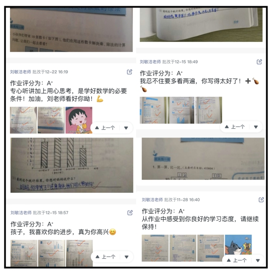 課后,她運(yùn)用激勵(lì)性的話語(yǔ)批改作業(yè),表達(dá)對(duì)學(xué)生的期望。對(duì)于作業(yè)中的錯(cuò)題,她及時(shí)通過(guò)語(yǔ)音、留言、電話等方式指導(dǎo)學(xué)生,督促學(xué)生及時(shí)訂錯(cuò)。她還利用周末休息的時(shí)間通過(guò)“小班課”視頻連線的方式,指導(dǎo)未訂正錯(cuò)誤、有疑惑的學(xué)生,做到逐一過(guò)關(guān),讓每一個(gè)孩子都不掉隊(duì)。