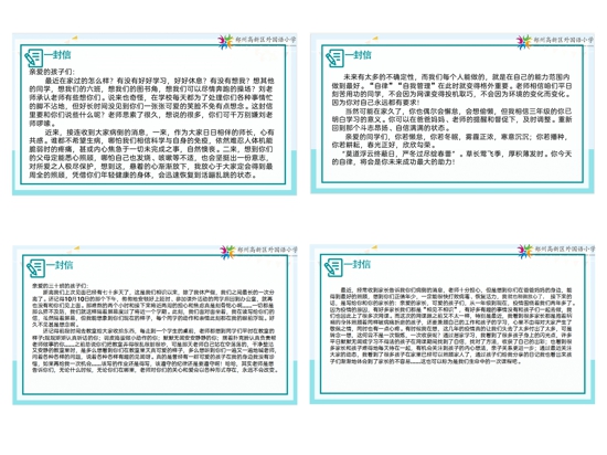 紙短情長(zhǎng),無(wú)盡思念。孩子們的健康牽掛著每一位老師的心,最近,各班班主任紛紛用書信的形式向孩子們傳遞溫暖,表達(dá)關(guān)愛(ài)。您瞧,周一班會(huì)上,班主任們“深情告白”,有殷殷期望、有點(diǎn)點(diǎn)叮嚀,有諄諄教誨、有濃濃愛(ài)意,還有深切的鼓勵(lì)、細(xì)微的指導(dǎo),以及滿滿的正能量引領(lǐng)。