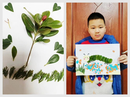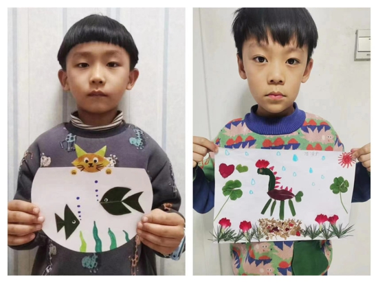 同時(shí),音樂老師在課堂上也會給學(xué)生播放與雨水節(jié)氣相關(guān)的音樂,讓學(xué)生在音樂中感知節(jié)氣。孩子們在了解、感知到雨水的相關(guān)知識后,便積極動(dòng)手,用樹葉、畫筆、彩紙等材料制作樹葉粘貼畫,記錄著自己眼中的雨水。