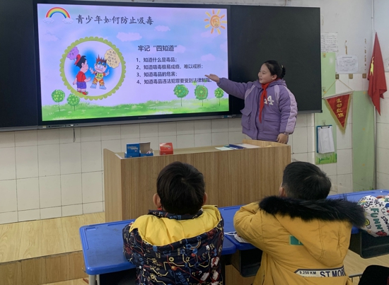 少先隊(duì)活動(dòng)課上,班主任老師結(jié)合各年級(jí)段學(xué)生的認(rèn)知能力和身心特點(diǎn),分別從學(xué)習(xí)禁毒知識(shí)、了解毒情形勢(shì)、認(rèn)清毒品危害、掌握必要的防毒技能幾個(gè)方面,為學(xué)生們講述了禁毒教育內(nèi)容,呼吁大家要堅(jiān)定面對(duì)不良事物,時(shí)刻保持清醒,堅(jiān)決守住底線,自覺抵制誘惑的決心。