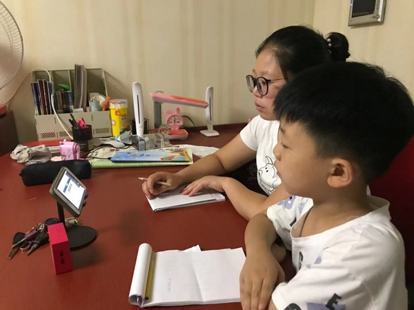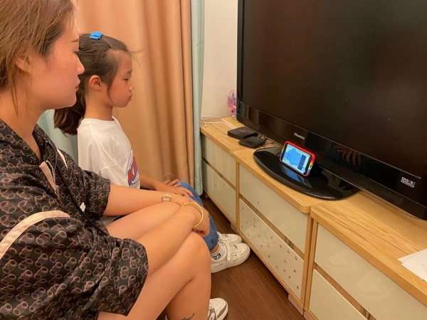 一二班胡斯語和媽媽在專注聽線上家長會(huì)