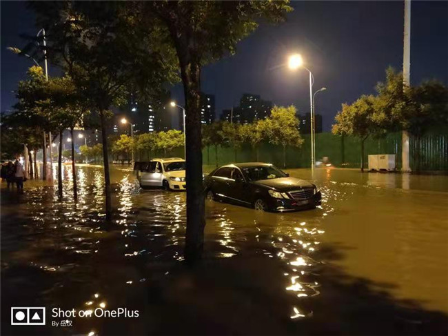 7月21號晚,會計2001班岳漢在濮陽市華龍區(qū)蘇北路中段,將兩位被困人員和車輛轉移至安全區(qū)域。