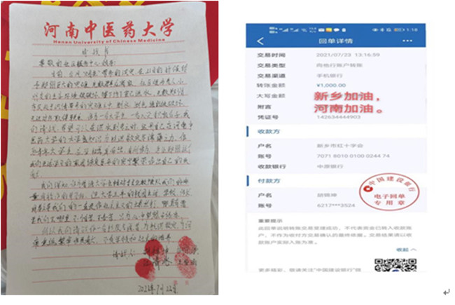 管理學(xué)院2018級(jí)學(xué)生胡錦坤聽聞鄭州市汛情嚴(yán)重,從家鄉(xiāng)返鄭后,在無水無電的出租屋里,以河南中醫(yī)藥大學(xué)入黨積極分子的身份寫下了申請(qǐng)加入抗洪救災(zāi)志愿者行列的請(qǐng)戰(zhàn)書。第一時(shí)間向社區(qū)請(qǐng)戰(zhàn)加入志愿者行列,疏散群眾、發(fā)放救災(zāi)物資、幫助老人搬出被泡物資、疏通道路等。鄭州汛情稍有緩解,新鄉(xiāng)又下起了大暴雨,胡錦坤盡己所能,把攢下來的1000元錢匯給了新鄉(xiāng)紅十字會(huì)用于救災(zāi)。