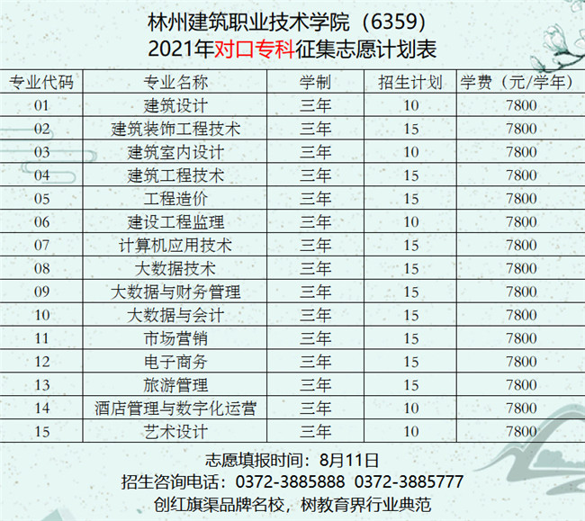 中新河南網(wǎng)8月9日電(魏豪)重要通知!河南特色高職院校——林州建筑職業(yè)技術(shù)學(xué)院(6359)對口專科、藝術(shù)?菩略鲇(jì)劃征集志愿!