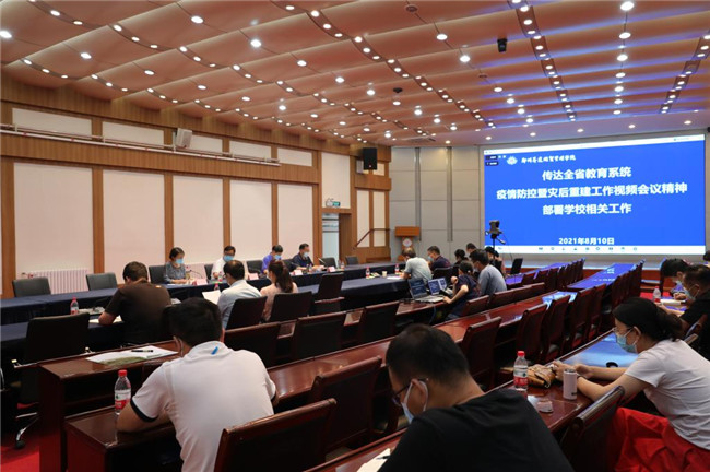 校黨委書記雷霆傳達了全省教育系統(tǒng)疫情防控暨災后重建工作視頻會議精神。他在講話中指出,全省教育系統(tǒng)疫情防控暨災后重建工作視頻會議,通報了全省疫情防控工作情況,對教育系統(tǒng)疫情防控和災后重建工作面臨的新形勢、新任務進行了全面分析,指出了下一步的重點任務和努力方向,并進行了具體部署,對學校做好下一步工作具有重要的指導意義。他就貫徹落實好本次會議精神特別強調,一是全校上下要深刻學習領會視頻會議精神,充分認識當前工作的嚴峻性、復雜性、特殊性,進一步提高政治站位、增強風險意識、強化責任擔當、認真貫徹落實。二是要緊緊圍繞會議提出的疫情防控、災后重建和開學準備三個方面的任務要求,強化統(tǒng)籌協(xié)調,壓實各方責任,優(yōu)化工作機制,確保各項工作高效運轉。三是要加強分類分級管控,校、院、班、宿舍四級聯動,堅持網格化管理模式,織密管理網格,全面摸清、精準掌握師生員工信息。四是要做好長期作戰(zhàn)的準備,堅決克服麻痹思想、厭戰(zhàn)情緒、僥幸心理、松勁心態(tài),從嚴從緊從實從細落實上級要求,堅決將疫情阻擋在校園之外。
