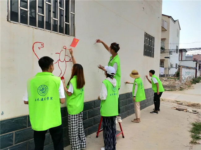 7月11日-12日,實(shí)踐團(tuán)成員按照活動(dòng)實(shí)施方案,通過對(duì)四明堂二村的實(shí)地考察,廣泛征求當(dāng)?shù)卮迕褚庖,結(jié)合當(dāng)?shù)匚湫g(shù)文化,對(duì)村子里的墻壁進(jìn)行現(xiàn)場(chǎng)清理,圍繞建黨一百周年以及鄉(xiāng)村文化元素主題,展開墻繪工作,讓村子里的墻壁因內(nèi)容而變得“生動(dòng)”起來。
