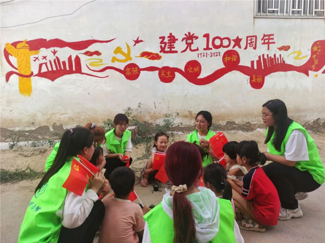 實(shí)踐團(tuán)在紅色主題文化墻下開展紅色教育、文化巡演活動(dòng),多才多藝的團(tuán)隊(duì)成員為小朋友們講述國(guó)旗故事、教小朋友們學(xué)唱紅歌。