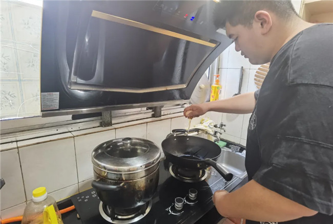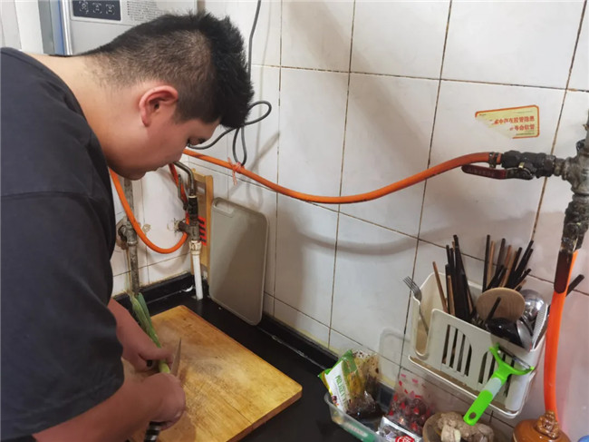 由于父母都在參與抗疫一線工作,在家閑暇的一博,除了看書,還學(xué)會了做飯:切蔥,香腸,炒雞蛋,加上隔夜飯,一份香噴噴的炒米就出鍋啦。
