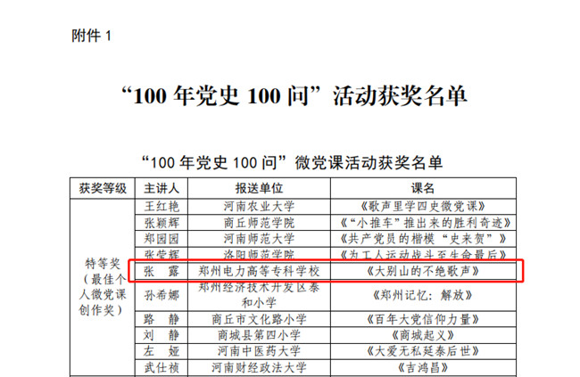 中新河南網(wǎng)8月20日電(魏豪 史航)近日,中共河南省委高校工委、河南省教育廳、河南廣播電視臺(tái)聯(lián)合下發(fā)通知,公布了慶祝建黨100周年部分活動(dòng)的獲獎(jiǎng)名單,鄭州電力高等?茖W(xué)校思想政治理論教學(xué)部教師張露制作的微黨課作品《大別山的不絕歌聲》榮獲“100年黨史100問”活動(dòng)特等獎(jiǎng)。