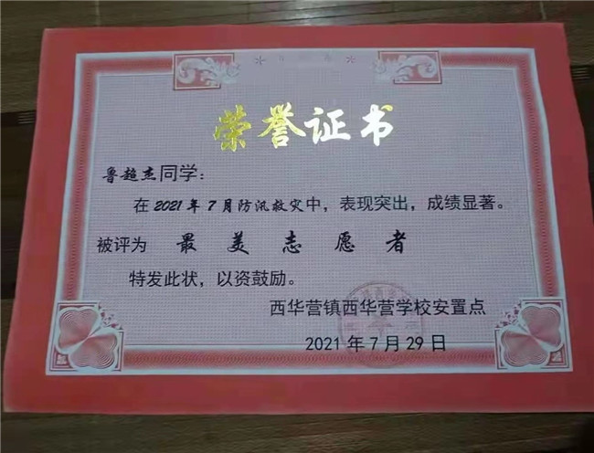 魯超杰,漯河職院2020級計應4班,積極參加防汛救災工作