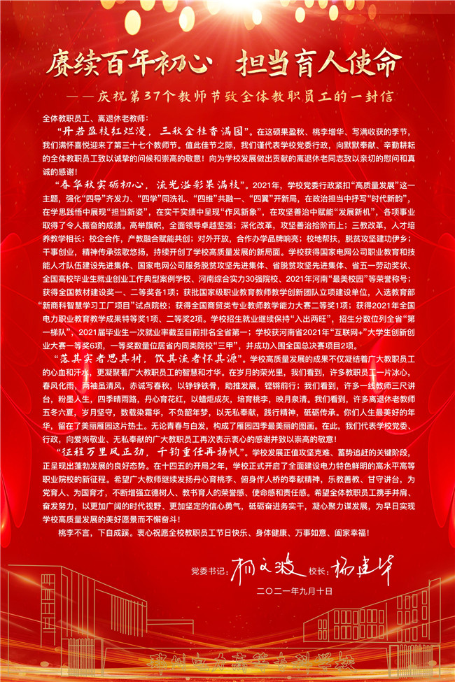 今年教師節(jié),鄭州電專慶;顒(dòng)以“賡續(xù)百年初心,擔(dān)當(dāng)育人使命”為主題,求真務(wù)實(shí)、勤儉節(jié)約、隆重簡(jiǎn)樸地開(kāi)展教師節(jié)各項(xiàng)活動(dòng),展現(xiàn)全校教師隊(duì)伍良好精神風(fēng)貌,營(yíng)造尊師重教的良好校園氛圍。