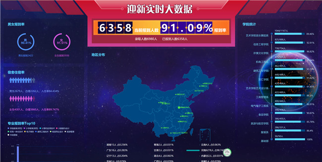 中新河南網(wǎng)9月24日電(魏豪)又是一年迎新季,漯河職業(yè)技術(shù)學(xué)院大屏幕上展示的迎新大數(shù)據(jù)格外亮眼,大數(shù)據(jù)實(shí)時(shí)動(dòng)態(tài)展示了學(xué)生的報(bào)到率、學(xué)生的分布、宿舍入住、各院系報(bào)到情況等多維度與迎新報(bào)到相關(guān)的信息,一目了然,這是漯河職業(yè)技術(shù)學(xué)院近年來(lái)通過(guò)信息化支撐引領(lǐng)學(xué)校教育教學(xué)改革的一個(gè)側(cè)面。