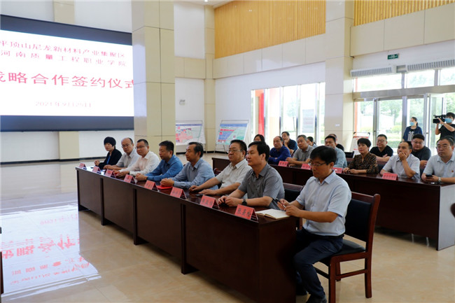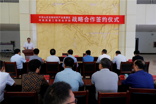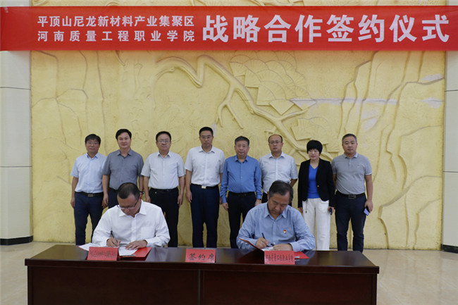 中新河南網9月26日電(魏豪)9月25上午,河南質量工程職業(yè)學院與平頂山尼龍新材料產業(yè)集聚區(qū)戰(zhàn)略合作簽約及尼龍新材料產業(yè)學院揭牌儀式在平頂山尼龍新材料產業(yè)集聚區(qū)綜合公共服務中心舉行。河南質量工程職業(yè)學院黨委書記邱紅標、院長鄭海金、常務副院長徐宗華,平頂山尼龍新材料產業(yè)集聚區(qū)黨工委書記李明、管委會主任李鵬鵬出席儀式。儀式由李明主持。