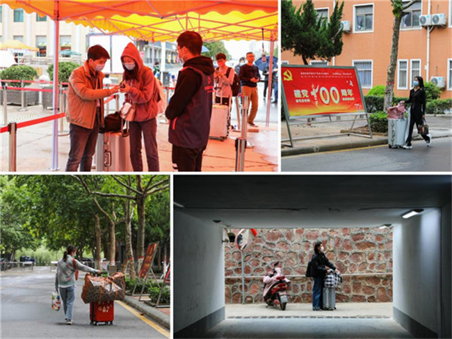 上午9時許,校領(lǐng)導(dǎo)一行前往學(xué)校西門口巡視學(xué)生返校防疫工作,走訪慰問返校學(xué)子、工作人員和志愿者,叮囑同學(xué)們要做好自我防護,盡快適應(yīng)返校生活,在學(xué)習(xí)的同時做好自身防疫衛(wèi)生。學(xué)校按照“分期、分批、錯時、錯峰”原則,合理安排各年級學(xué)生入校報到開學(xué)。返校首日為金貿(mào)學(xué)院、會計學(xué)院、管理學(xué)院、藝術(shù)學(xué)院的約3800余名大四學(xué)生。他們冒著淅瀝的秋雨,頂著寒風(fēng),戴著口罩,拉著行李,懷著激動的心情陸續(xù)返校。