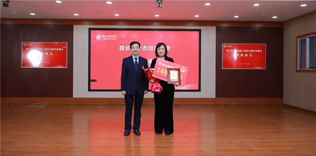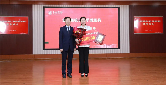 陳向煒與校長教學(xué)杰出貢獻(xiàn)獎獲得者楊靜頒獎合影