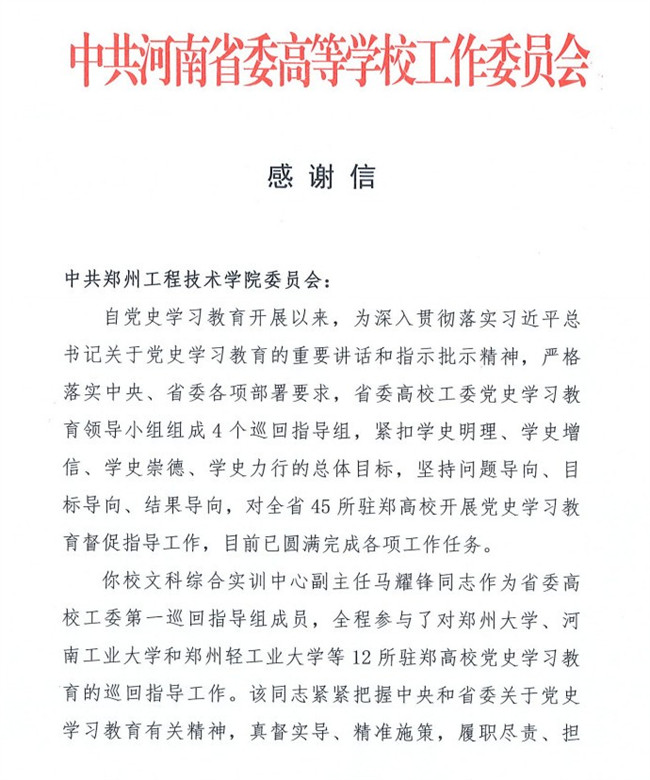 中共河南省委高等學(xué)校工作委員會(huì) 感謝信 中共鄭州工程技術(shù)學(xué)院委員會(huì):