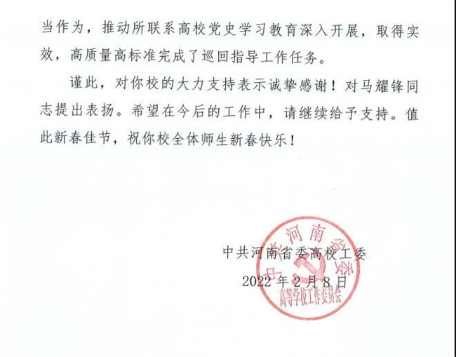 近日,省委高等學(xué)校工作委員會(huì)給鄭州工程技術(shù)學(xué)院黨委發(fā)來感謝信。信中對(duì)該校文科綜合實(shí)訓(xùn)中心副主任馬耀鋒作為省委高校工委第一巡回指導(dǎo)組成員,在駐鄭高校黨史學(xué)習(xí)教育督導(dǎo)中緊緊把握中央和省委關(guān)于黨史學(xué)習(xí)教育有關(guān)精神,真督實(shí)導(dǎo)、精準(zhǔn)施策,履職盡責(zé)、擔(dān)當(dāng)作為,推動(dòng)所聯(lián)系高校黨史學(xué)習(xí)教育深入開展,取得實(shí)效,高質(zhì)量高標(biāo)準(zhǔn)完成了巡回指導(dǎo)工作任務(wù)一事表達(dá)了感謝和贊賞。