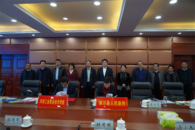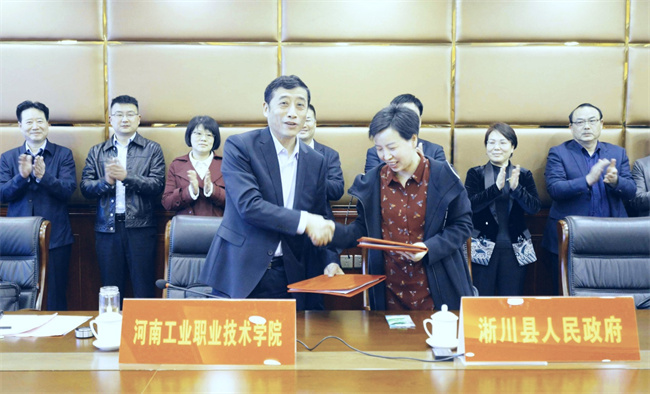 簽約儀式上,河南工業(yè)職業(yè)技術(shù)學(xué)院校長王偉與淅川縣人民政府副縣長唐云芝簽訂《河南工業(yè)職業(yè)技術(shù)學(xué)院 淅川縣人民政府 合作框架協(xié)議》。