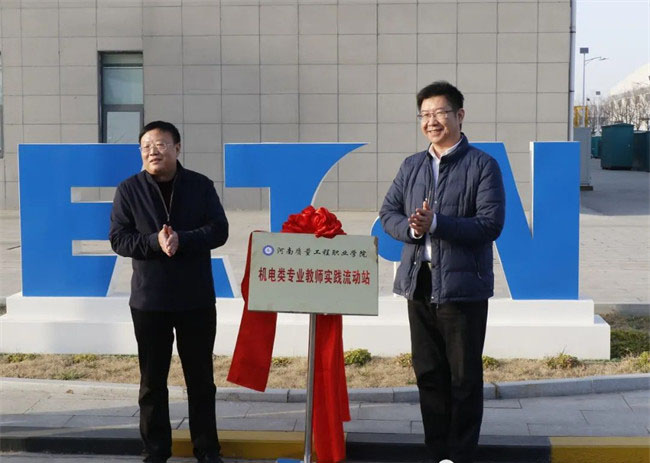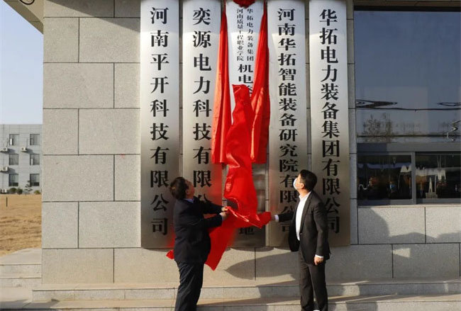 邱紅標(biāo)和凌兵奎共同為“平頂山高新技術(shù)產(chǎn)業(yè)開發(fā)區(qū)管理委員會、河南質(zhì)量工程職業(yè)學(xué)院電氣裝備產(chǎn)業(yè)學(xué)院”揭牌;徐宗華和華拓電力裝備集團(tuán)有限公司總裁李憲鵬共同為“河南質(zhì)量工程職業(yè)學(xué)院機(jī)電專業(yè)產(chǎn)教融合生產(chǎn)性實訓(xùn)基地”揭牌;田新現(xiàn)和伊頓平頂山工廠總經(jīng)理高付民共同為“河南質(zhì)量工程職業(yè)學(xué)院機(jī)電專業(yè)教師實踐流動站”揭牌。
