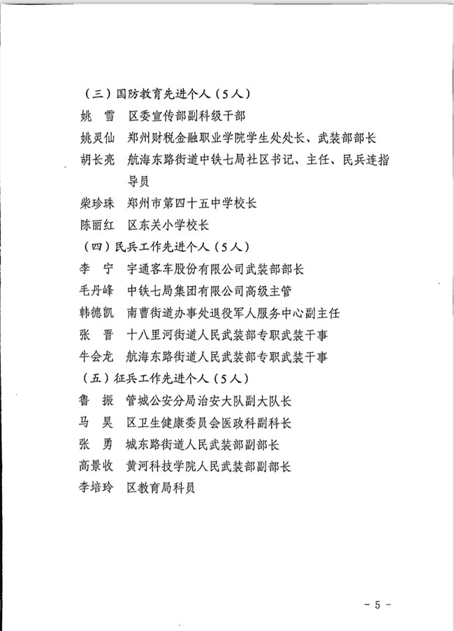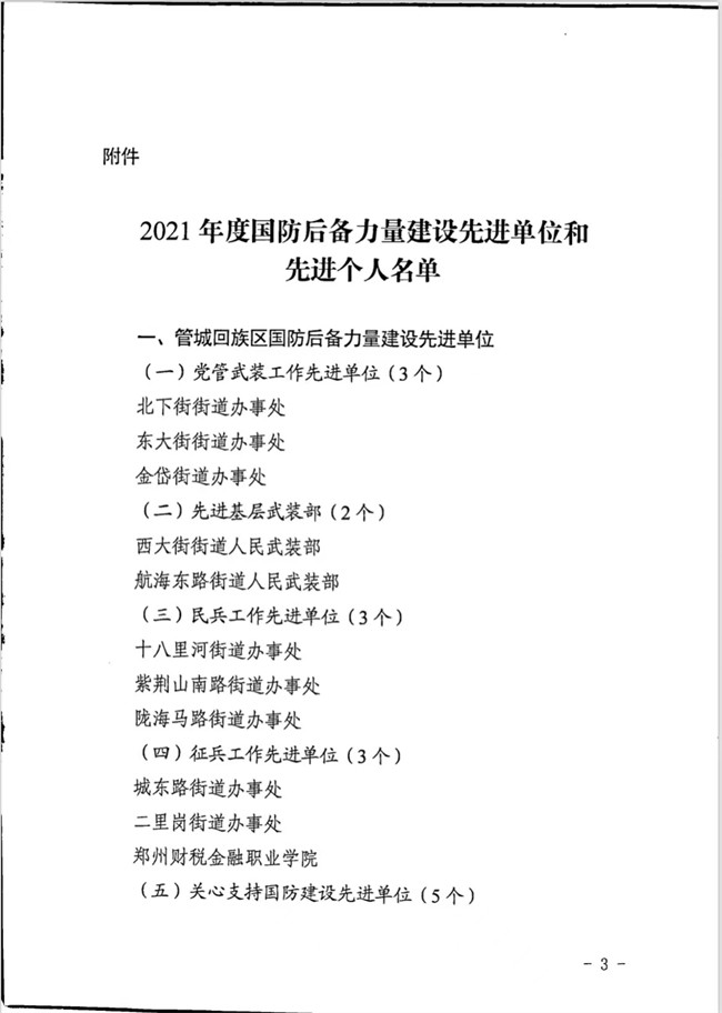 中新河南網(wǎng)3月11日電(王曉彤) 日前,鄭州市管城回族區(qū)人民政府、管城回族區(qū)人民武裝部下發(fā)《關(guān)于表彰2021年度國防后備力量建設(shè)先進(jìn)單位和先進(jìn)個人的通報(bào)》(管文〔2022〕21號),鄭州財(cái)稅金融職業(yè)學(xué)院被評為“2021年度管城區(qū)征兵工作先進(jìn)單位”,該院學(xué)生處處長姚靈仙被評為“2021年度管城區(qū)國防教育先進(jìn)個人”。