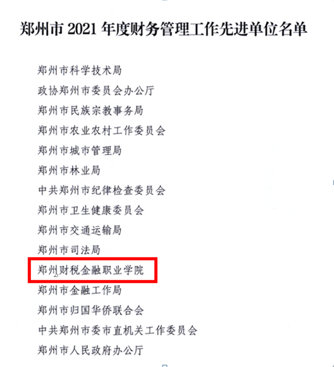 鄭州財(cái)稅金融職業(yè)學(xué)院榮獲鄭州市2021年度財(cái)務(wù)管理工作先進(jìn)單位