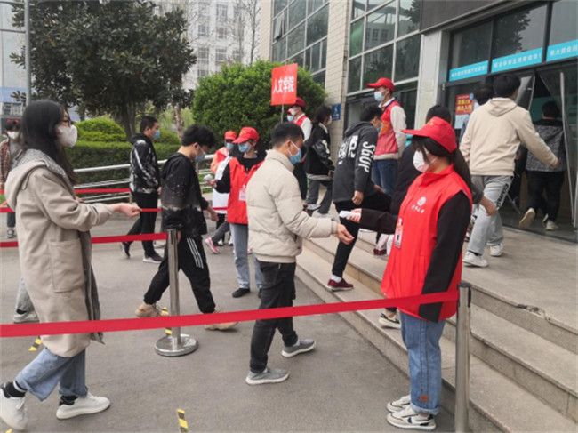 一是爭(zhēng)做校園疫情防控的“戰(zhàn)斗員”。3月20日,校團(tuán)委迅速集結(jié)60余名志愿者,進(jìn)行次日全校核酸檢測(cè)的路線引導(dǎo)、秩序維護(hù)和防護(hù)提醒。志愿者在核酸檢測(cè)外圍引導(dǎo)師生整齊有序排隊(duì),提醒全程佩戴口罩,保持“一米線”安全距離,用實(shí)際行動(dòng)做好疫情防控的守門員、引導(dǎo)員、服務(wù)員,為疫情防控保駕護(hù)航。