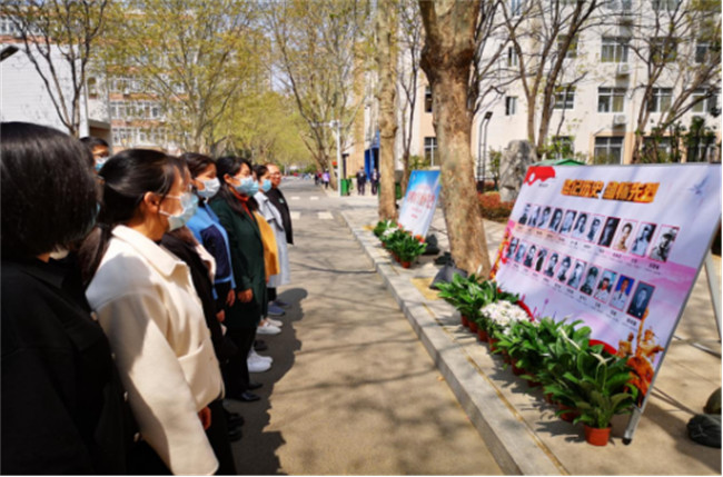活動二:清明祭英烈活動。4月2日,基礎(chǔ)部在校園內(nèi)舉辦了清明節(jié)緬懷英烈活動,以展板宣傳的形式紀念英烈,胡莉莉主任帶領(lǐng)大家在莊重肅穆的烈士展板前肅立默哀并三鞠躬致敬革命先烈,共產(chǎn)黨員重溫入黨誓詞,表達對先烈的崇敬之意、緬懷之情。此次活動激發(fā)了教師們愛崗敬業(yè)的工作熱忱,誓以英烈為榜樣,不忘初心,牢記使命,為教育事業(yè)高質(zhì)量發(fā)展作出新的貢獻。