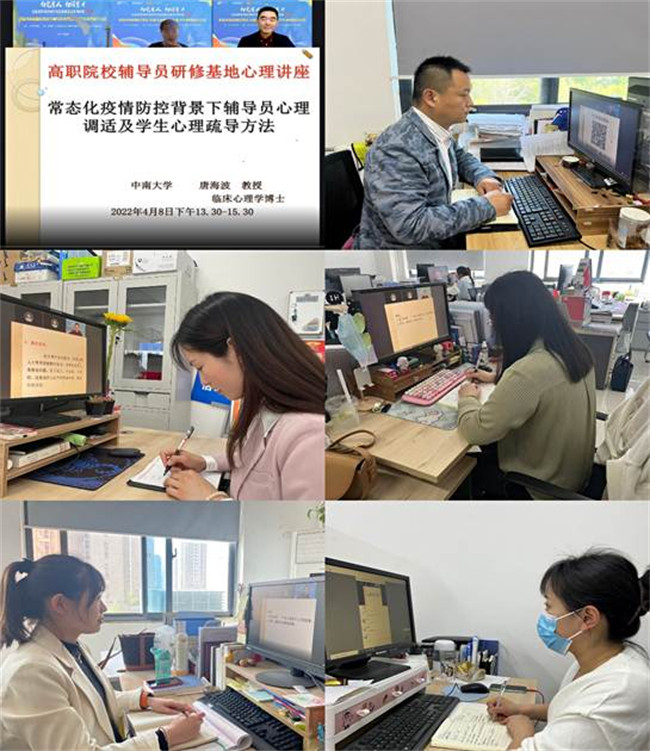 第二個(gè)專題由中南大學(xué)心理健康教育與咨詢專家唐海波教授通過線上課堂講授的《常態(tài)化疫情防控背景下輔導(dǎo)員心理調(diào)試及學(xué)生心理疏導(dǎo)方法》,此次講座為“第一期全國高職院校輔導(dǎo)員高質(zhì)量發(fā)展系列講座”。唐教授通過講述高壓工作環(huán)境下的焦慮情緒自我調(diào)節(jié)技巧,使輔導(dǎo)員老師們學(xué)會(huì)心理咨詢的助人自助,學(xué)會(huì)更有效的途徑促進(jìn)學(xué)生的身心健康和自身素質(zhì)的全面發(fā)展。通過此次專題系列培訓(xùn),輔導(dǎo)員們紛紛表示收獲頗多,受益匪淺,今后要加強(qiáng)學(xué)習(xí),不斷提高綜合素質(zhì)和能力,對于心理問題學(xué)生做到早發(fā)現(xiàn)、早處置、早干預(yù)。