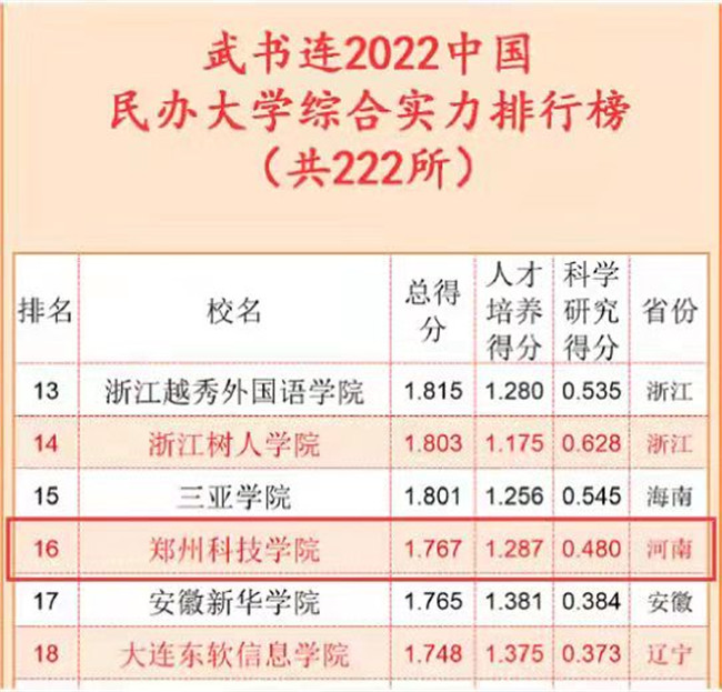 鄭州科技學院名列武書連2022中國民辦大學綜合實力排行榜全國第十六位