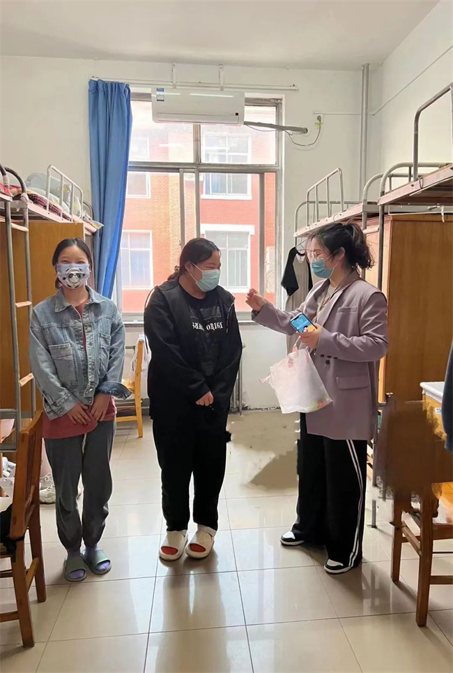 疫情來(lái)襲,文法學(xué)院輔導(dǎo)員張?zhí)饓?mèng)老師,毫不猶豫選擇了逆行。她告別父母、告別孩子,帶著家人的支持和祝福來(lái)到學(xué)校。問起張老師動(dòng)力是什么?她的答案是:一份守護(hù)校園的美好初心。在近期頻繁進(jìn)行的核酸檢測(cè)中,張老師妥善安排,幫助班上因崴腳骨折而行動(dòng)不便的學(xué)生優(yōu)先進(jìn)行核酸檢測(cè),使其免于長(zhǎng)時(shí)間站立。張老師關(guān)心學(xué)生的身體狀況和生活起居,她囑咐學(xué)生安心休養(yǎng),并多次到學(xué)生宿舍進(jìn)行慰問,為學(xué)生送去溫暖和關(guān)愛。