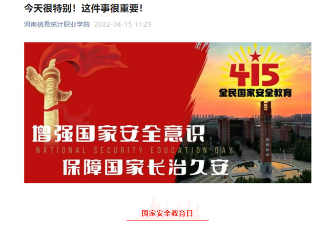 專題講座全覆蓋。各部門積極組織教師通過線上形式集體觀看河南省教育系統(tǒng)國家安全教育日啟動儀式,思政課教師積極參與全省大中小學(xué)思政課集體備課展示活動,并觀看由國家保密局制作推出的2022年保密公益宣傳片《保密防線》。大家表示,通過集體學(xué)習(xí)和觀看國家安全專題宣傳片,了解了國家安全觀的內(nèi)涵和價值,增強(qiáng)了保密意識,要從自身做起,堅決抵制危害國家安全的行為。