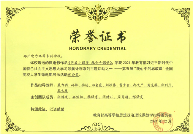 2021年5月,“我心中的思政課”——微電影評選活動拉開帷幕,鄭州電力高專黨委學(xué)工部、思政部和經(jīng)濟管理學(xué)院積極籌劃、認真準備,積極與百世快遞企業(yè)聯(lián)合拍攝微電影《思政小課堂 社會大課堂》。經(jīng)河南省教育廳層層篩選,鄭州電力高專選送的作品與鄭州大學(xué)、河南理工大學(xué)等11所高校的作品入圍第五屆“我心中的思政課”全國高校大學(xué)生微電影展示活動,最終榮獲全國優(yōu)秀獎。