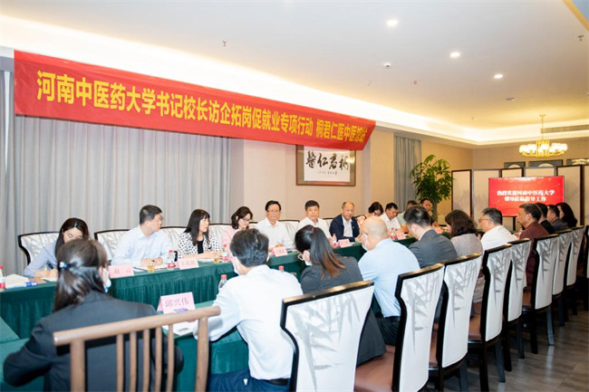 許二平在認(rèn)真聽取企業(yè)介紹后,介紹了學(xué)校的基本情況、學(xué)科建設(shè)、人才培養(yǎng)以及學(xué)校的畢業(yè)生就業(yè)工作。他強(qiáng)調(diào),此次走訪調(diào)研,是落實(shí)教育部辦公廳、河南省教育廳開展高校書記校長(zhǎng)訪企拓崗促就業(yè)專項(xiàng)行動(dòng)相關(guān)文件要求的具體舉措。就進(jìn)一步促進(jìn)學(xué)校畢業(yè)生充分高質(zhì)量就業(yè),許二平表示,校企雙方要共同探討中醫(yī)藥事業(yè)的發(fā)展、中醫(yī)藥人才的培養(yǎng),為畢業(yè)生搭建就業(yè)橋梁,創(chuàng)建更好的合作平臺(tái);要共同推進(jìn)就業(yè)基地建設(shè),加強(qiáng)校企融合,校方要為企業(yè)推薦優(yōu)秀畢業(yè)生,同時(shí)也誠(chéng)摯歡迎企業(yè)為學(xué)校人才培養(yǎng)等方面提供寶貴意見和建議。許二平指出,通過本次走訪校友企業(yè),深切感受到了校友對(duì)中醫(yī)藥事業(yè)發(fā)展的責(zé)任感、以及濃濃的中醫(yī)藥情結(jié),頗有感觸,希望下一步能攜手未來,共同促進(jìn)中醫(yī)藥事業(yè)蓬勃發(fā)展。學(xué)校將以此次走訪為契機(jī),進(jìn)一步提高學(xué)生的理論水平及實(shí)踐操作技能,提高職業(yè)能力、就業(yè)本領(lǐng),為中醫(yī)藥事業(yè)發(fā)展做出更大貢獻(xiàn)。