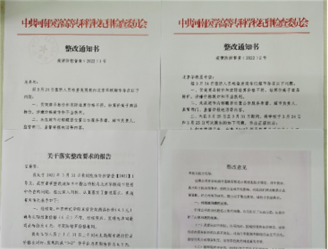 最后是下達《整改通知書》,對于在3月24日值班巡查中發(fā)現(xiàn)的北京華聯(lián)校內超市存在的問題,紀委監(jiān)察室同時向超市經營方和學校監(jiān)管部門總務處下發(fā)《整改通知書》;對于在突擊檢查學生在校狀態(tài)被通報學生所在黨總支,紀委監(jiān)察室也下發(fā)《整改通知書》,要求相關責任部門立行立改,并向紀委監(jiān)察室提交整改報告。截止目前,校紀委共發(fā)出《整改通知書》六份。
