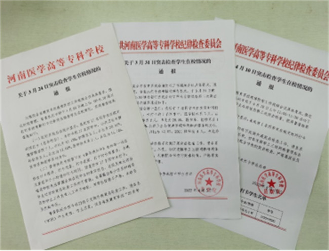 其次是通報,比如每次突擊檢查學生在校情況后,紀委監(jiān)察室針對純屬個人原因未在規(guī)定時間打卡的同學,均予以全校通報,同時責令被通報學生寫出書面檢查。目前,學生未打卡人數已經由第一次檢查時的17人大幅下降至第三次檢查時的1人。另外對連續(xù)兩天未按時釘釘健康打卡的教職工,我們及時在“疫情防控督導工作群”里予以通報。截止目前,校紀委共發(fā)出《通報》七份。