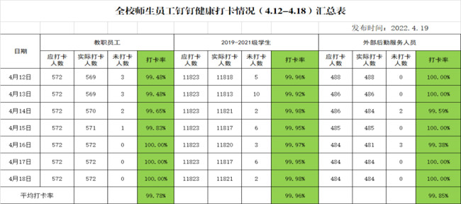 截止4月26日,紀委監(jiān)察室共反饋學生打卡統(tǒng)計情況230次,發(fā)布全校人員打卡匯總表30期,學生平均打卡率超過99.96%,教職工和外來務工人員均超過了99.60%。