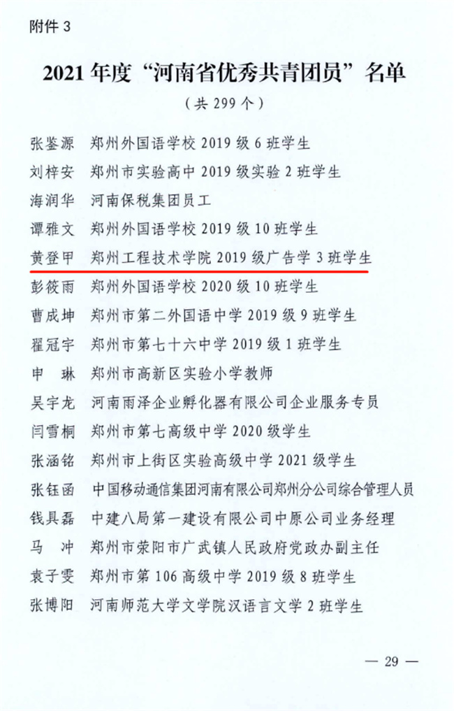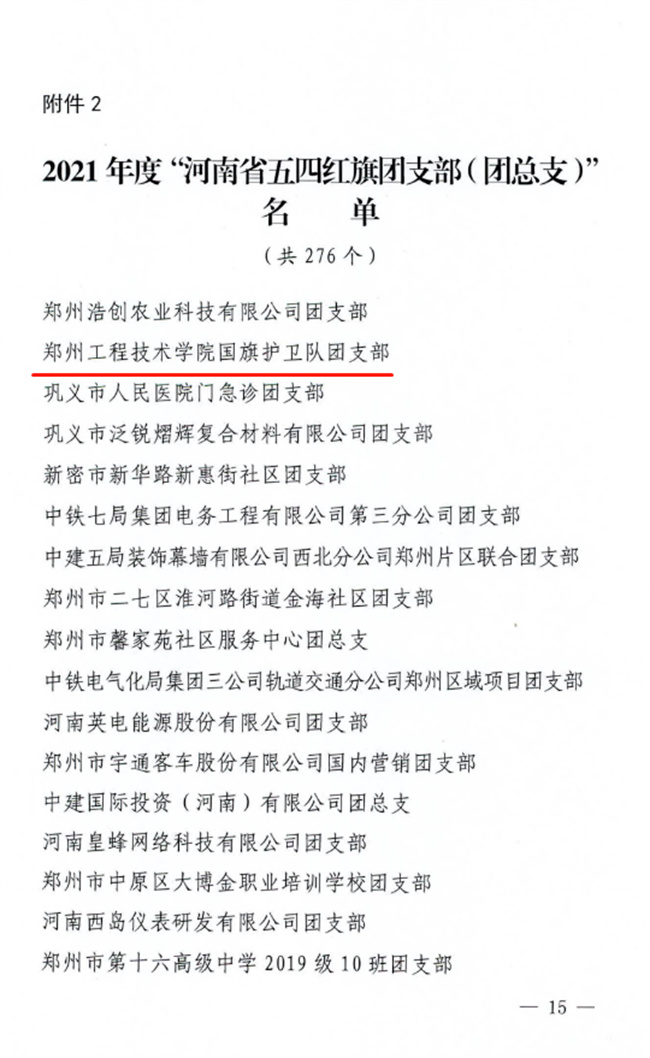中新河南網5月2日電 近日,團省委下發(fā)關于表揚河南省五四紅旗團委、團支部和優(yōu)秀共青團員、共青團干部的通知,鄭州工程技術學院國旗護衛(wèi)隊團支部榮獲“河南省五四紅旗團支部”榮譽稱號;該校傳媒學院黃登甲榮獲“河南省優(yōu)秀共青團員”榮譽稱號。