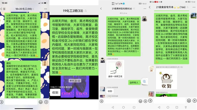 學(xué)院領(lǐng)導(dǎo)深夜召開線上會議,召集全體學(xué)工隊(duì)伍和班導(dǎo)師,火速下沉班級,做好學(xué)生信息統(tǒng)計(jì)、后勤保障及情緒疏導(dǎo)工作。凌晨接到緊急統(tǒng)計(jì)通知,全體學(xué)工隊(duì)伍逐一確認(rèn)、逐條核實(shí)、準(zhǔn)時上報(bào),筑牢疫情防控?cái)?shù)據(jù)“第一線”。同時,密切關(guān)注省內(nèi)外疫情最新數(shù)據(jù),及時轉(zhuǎn)發(fā)官方通知、權(quán)威消息,安排落實(shí)學(xué)生全員核酸檢測工作,跟進(jìn)未檢測人員信息,了解校外畢業(yè)設(shè)計(jì)學(xué)生及未返校學(xué)生當(dāng)日健康狀況。