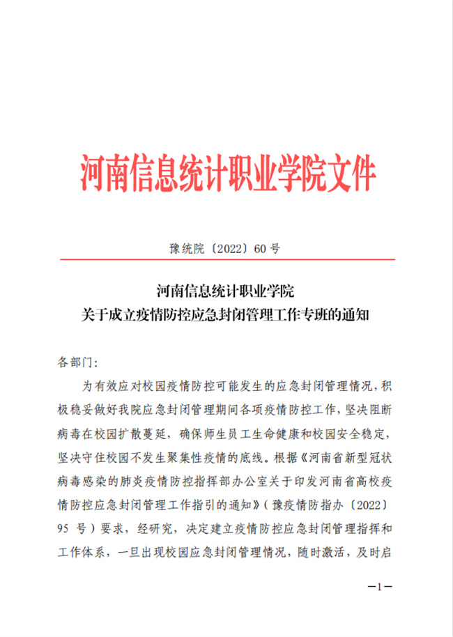 加強組織領(lǐng)導,落實落細有力度。為充分發(fā)揮黨的領(lǐng)導在疫情防控工作中的最大優(yōu)勢,河南信息統(tǒng)計職業(yè)學院黨委成立由黨委書記、院長擔任組長的疫情防控應急封閉管理工作專班。專班下設9個應急處置專項工作組。為切實提高應急處置工作時效性和針對性,河南信息統(tǒng)計職業(yè)學院在金水和白沙校區(qū)分別設置疫情防控指揮小組,學院領(lǐng)導分組負責校區(qū)防控工作,及時分析形勢、研判情況,因地制宜精準調(diào)度疫情應對處置工作,確保防疫和服務措施落細落實。