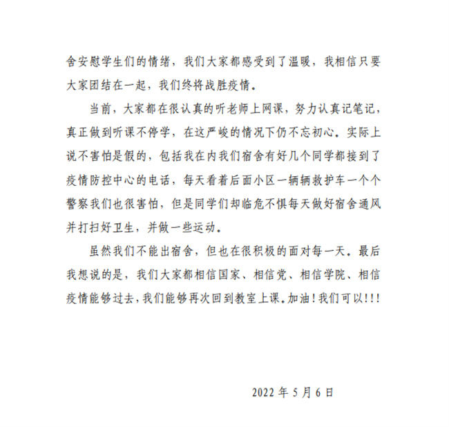 當深夜降臨,月亮升起,宿舍一盞盞等漸次熄滅,校園又如往昔沉靜下來,看到一名學生發(fā)來的感言,還有綜合樓宿舍學生的一幅漫畫,我們一掃一天的勞累,內(nèi)心深處涌現(xiàn)出絲絲暖意。我們堅信,在學院黨委的堅強領(lǐng)導下,全體教職員工將以舍我其誰的決心和勇?lián)厝蔚淖黠L,將更迅速更規(guī)范更精準落實校園管理、核酸檢測、學生思想教育等各項工作,一定能夠堅決阻斷校內(nèi)校外疫情傳播鏈,全力以赴打贏疫情防控阻擊戰(zhàn)。