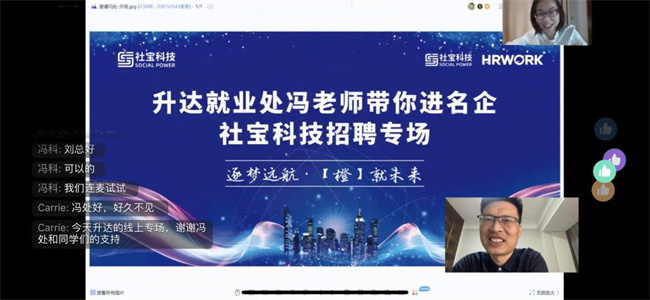 上午11時,直播帶崗活動正式開始,直播間里馮科老師首先對校友企業(yè)社寶科技來校參與云招聘表示歡迎,對社寶科技首席人才官劉碧林女士、人力資源總監(jiān)胡曉燕女士參與直播帶崗活動表示感謝。馮科指出,新一輪疫情來的出乎意料,鄭州疫情的突發(fā),使各個行業(yè)幾乎按下了暫停鍵,學(xué)校又一次開啟了全面封校,今年的畢業(yè)生面臨的就業(yè)困難比往屆的更多。社寶信息科技是校優(yōu)秀校友李賢威創(chuàng)辦,也是校重點校企合作單位,每年來校招聘各專業(yè)的畢業(yè)生,累計入職實習(xí)生100多人,目前運營崗位、客服等管理崗位在崗30余名。隨后,馮科就畢業(yè)生“慢就業(yè)”問題、招聘崗位晉升路徑等問題與社寶科技胡總進行了溝通。