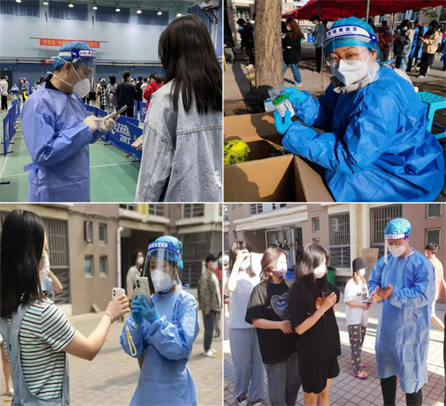 學(xué)院老師們穿著厚厚的防護服不論烈日寒風(fēng),在核酸檢測現(xiàn)場為同學(xué)們掃碼登記。