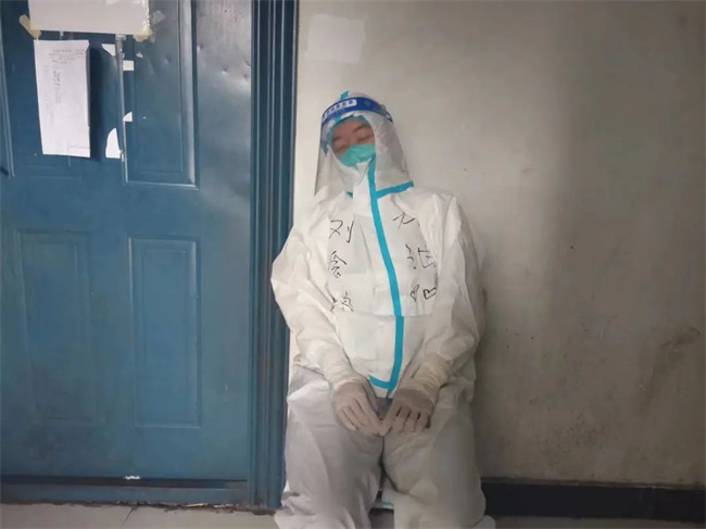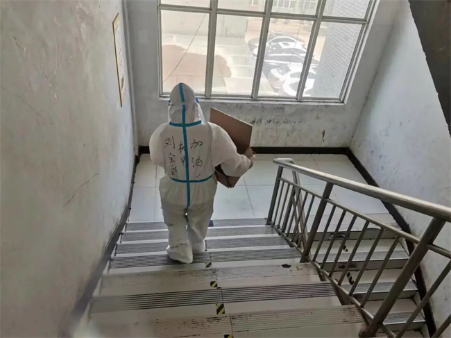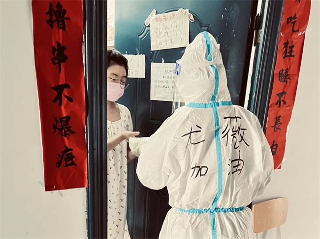 劉欣負責A棟宿舍樓值班和分餐任務,為了給生病的學生送藥,匆忙趕路時不慎摔倒,她來不及處理傷口,第一時間把藥送到學生手中。介科懿負責一天兩次核酸檢測,每天走的最早、回來的最晚。原本講壇上端莊優(yōu)雅的女教師,化身抗疫女戰(zhàn)士,在彼此的眼神中,她們看到了會心一笑的默契。原來,這不美的樣子真颯!