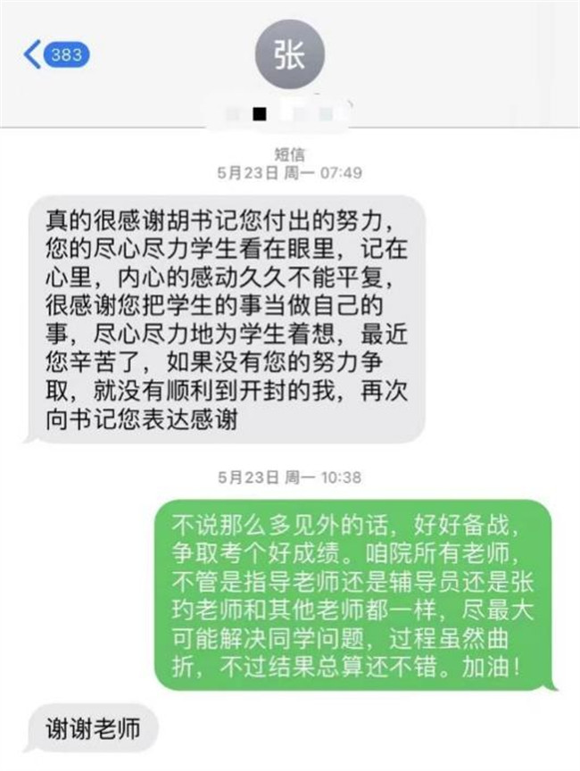 小張同學(xué)給輔導(dǎo)員和副書記都發(fā)了很長(zhǎng)的信息,她說:“真心感謝老師們付出的努力,老師們的盡心盡力我們看在眼里、記在心里。很感激學(xué)校和老師把學(xué)生的事當(dāng)做自己的事,全心全意地為學(xué)生著想。如果沒有學(xué)校的協(xié)調(diào)、老師們的努力爭(zhēng)取,就不可能這么順利返回開封到達(dá)學(xué)校。”